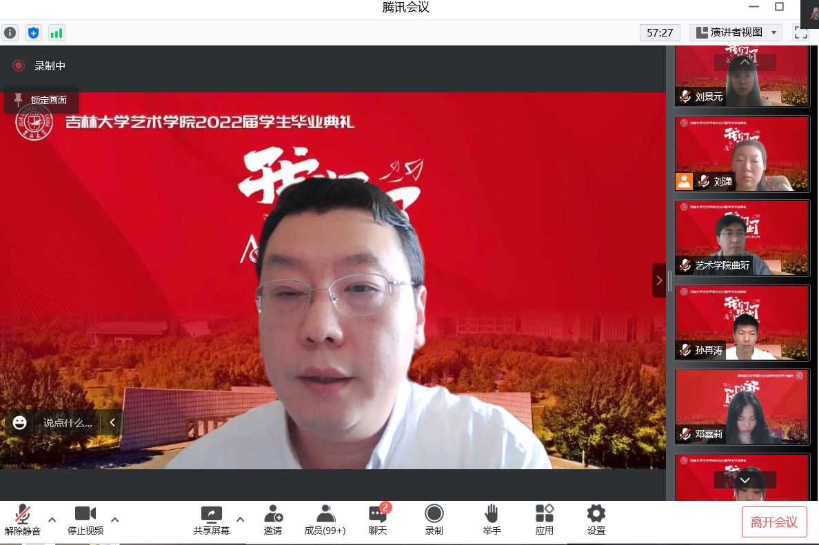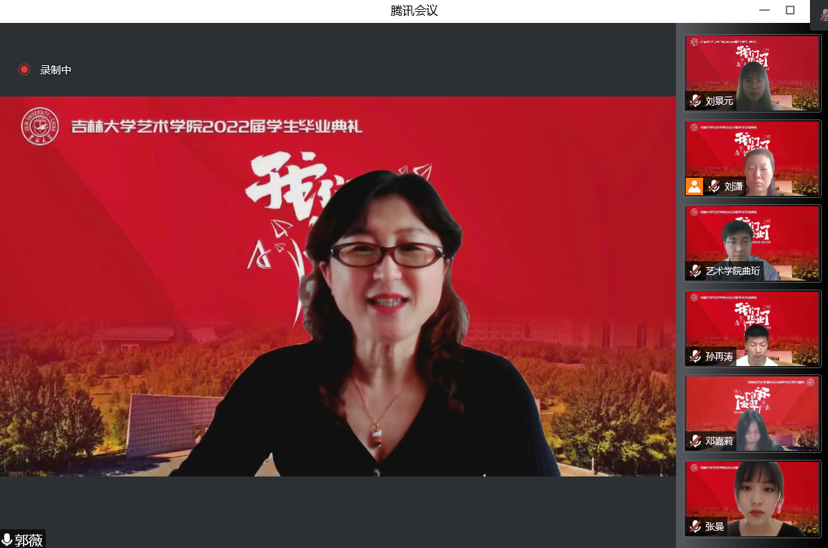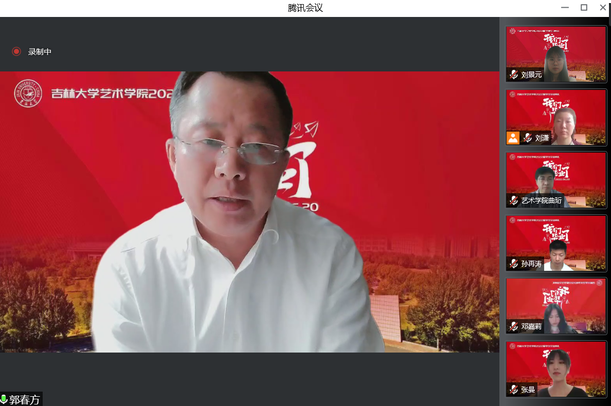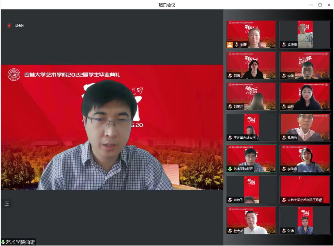 院长郭春方教授致词。他以《文以载道艺以弘德》为题,从三个方面与毕业学子分享关于艺术与人生追求的思考,作为母校为同学们准备的最后一份“毕业礼物”。一是文艺创作,要为时代放歌。文艺是时代前进的号角,文艺创作只有植根现实生活、紧跟时代潮流,才能真正做到思想精深、艺术精湛、制作精良。疫情暴发以来,全院师生创作了系列以抗击疫情为主题的优秀作品,讲述着我们身边的抗疫故事。文艺最能代表一个时代的风貌,也最能引领一个时代的风气。在以“艺”抗疫的征途上奋勇向前,在前所未有的困境中携手前行,共同感受着党和国家在抗击灾难时所爆发出的巨大能量,力尽所能地肩负起吉大人的使命与担当。二是文艺创作,要扎根祖国大地。当代的中国文艺,是包含艺术哲学与精神内涵的时代产物,是反映中华民族精神面貌与审美趣味的文化沉淀,是能够服务于国家需求并引领结构创新的艺术符码。需要在复杂的时代价值环境中,注重全球共识性与民族个性的融通,注重中国语境与国家文明的坚守。扎根祖国大地,发出中国声音,讲述中国故事,扩大“中国艺术”的影响力,是每一名文艺工作者义不容辞的使命与责任。三是文艺创作,要回应民之关切。“中国艺术的生命精神,就是一种以生命为本体,为最高真实的精神”。艺术的真实来源于生活,并对其进行提炼和萃取。文艺工作者的世界观决定了创作过程中的立场、态度和情感。修辞立其诚,艺术之路上,思想的高度、文化的传承、科技的创新,都离不开以人民为中心的创作导向。正如七十六载来,吉大以毫不利己、专门利人的白求恩精神;以一路向北、扎根东北的“北上精神”;以心有大我、至诚报国的黄大年精神,为国家的发展、民族的振兴、社会的进步作出了巨大的贡献。