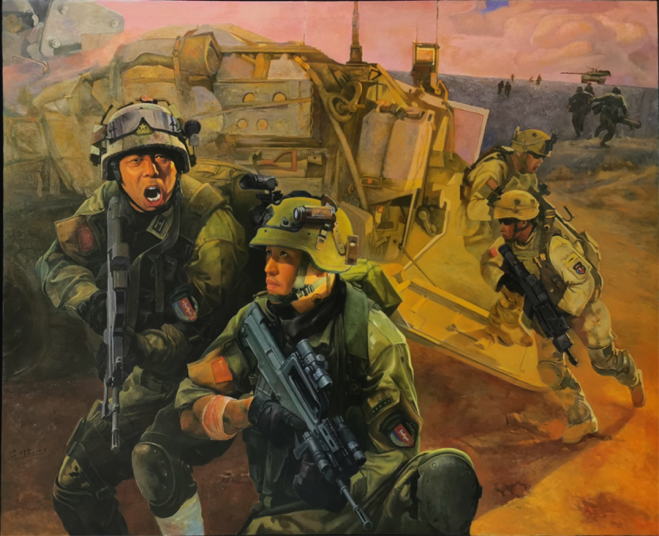 此次展览以习近平新时代中国特色社会主义思想为指导,深入贯彻强军思想和习主席关于文艺工作的重要概述,是新时代美术创作的一次集中检阅,展览面向全国全军征集优秀美术作品,也是五年一届的全国性美术大展,将于8月1日-11日在中国美术馆进行展出。按照中国美术家协会全国美展标准和要求,聘请军地专家组成评审委员会,组织初评、复评,初评入围作品共计758件,最终复评入选作品472件。其中油画作品共144件,我省共有三位艺术家入选,我院教师占两位。他们用绘画的艺术形式弘扬时代主旋律,展示了我院教师深厚的艺术底蕴。也是成人av