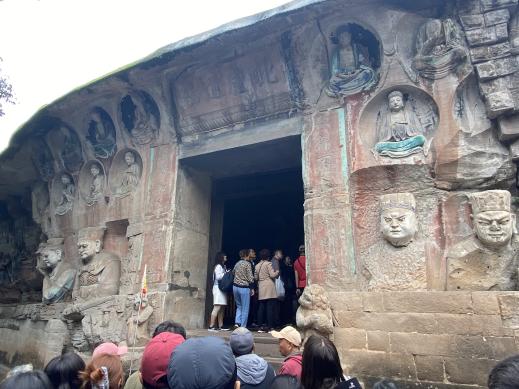 行程末站抵达重庆,师生参观大足石刻,重点观摩北山、宝顶山石刻群,深入解读宋代石窟艺术的宗教叙事、雕刻技法与世俗化表现,拓展了对中国传统雕塑与空间叙事的认知。随后在重庆三峡博物馆,通过"壮丽三峡""远古巴渝"等展厅的系统参观,同学们全面了解了长江流域的自然地理、历史文脉与多民族聚居区的文化变迁,进一步建立起区域文化与整体性设计思维的关联。