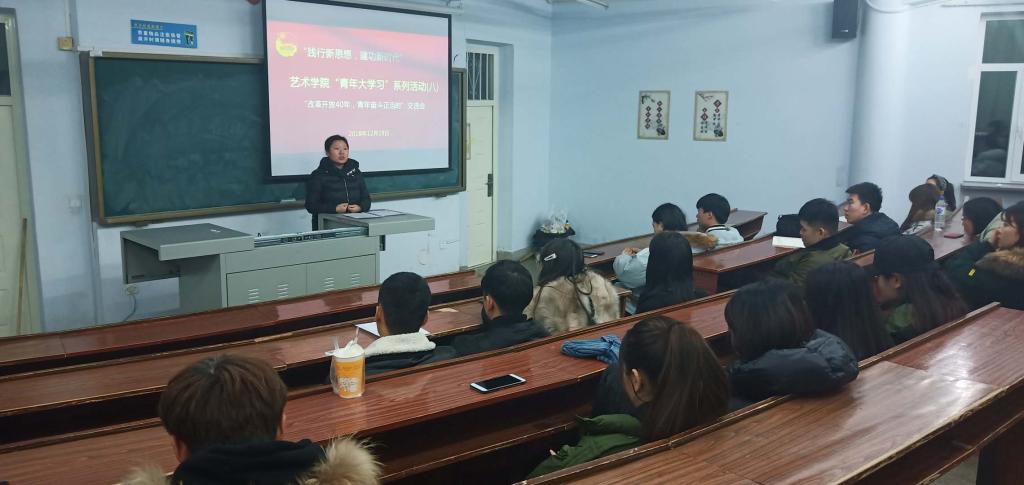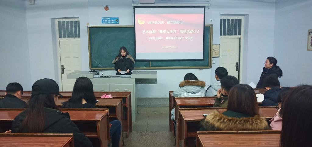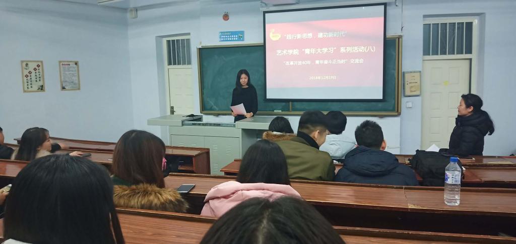 2018年是改革开放40周年,前进的脚步敲击着时代的大门。中国特色社会主义进入了新时代、中国共产党形成了习近平新时代中国特色社会主义思想、中华民族开启了全面建设社会主义现代化国家的新征程。2018年12月19日下午6时,团学组织骨干在萃文楼阶梯教室开展了“改革开放四十年,青年奋斗正当时”交流会。团委书记刘潇老师出席此次会议。