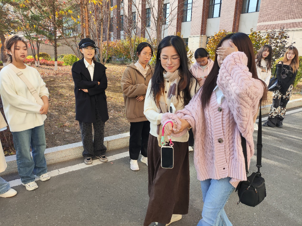 室内活动阶段,“信任之旅”环节尤为引人注目,由一位同学蒙住双眼,另一位同学充当引路人,以无声的方式引导蒙眼同学沿着特定路线行并避开障碍。接着,“集体登陆”游戏让小组成员紧紧相拥。而在“人体字母”游戏中,各小组成员用身体摆出各种英文单词供同学们竞猜,现场一片欢声笑语,既增强了同学们表达、觉察、体验和反思的能力,又增进了同学们彼此之间的感情。