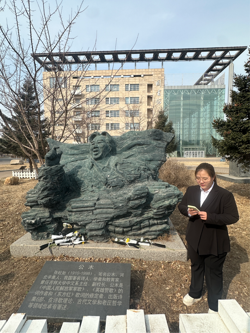 随后主持人宣读了祭文,并带领大家进行宣誓。同学们手持菊花向公木先生默哀致敬,并行鞠躬礼。接着同学们向公木先生依次献花表达崇高敬意。最后,学生代表闫慧怡进行了表态。