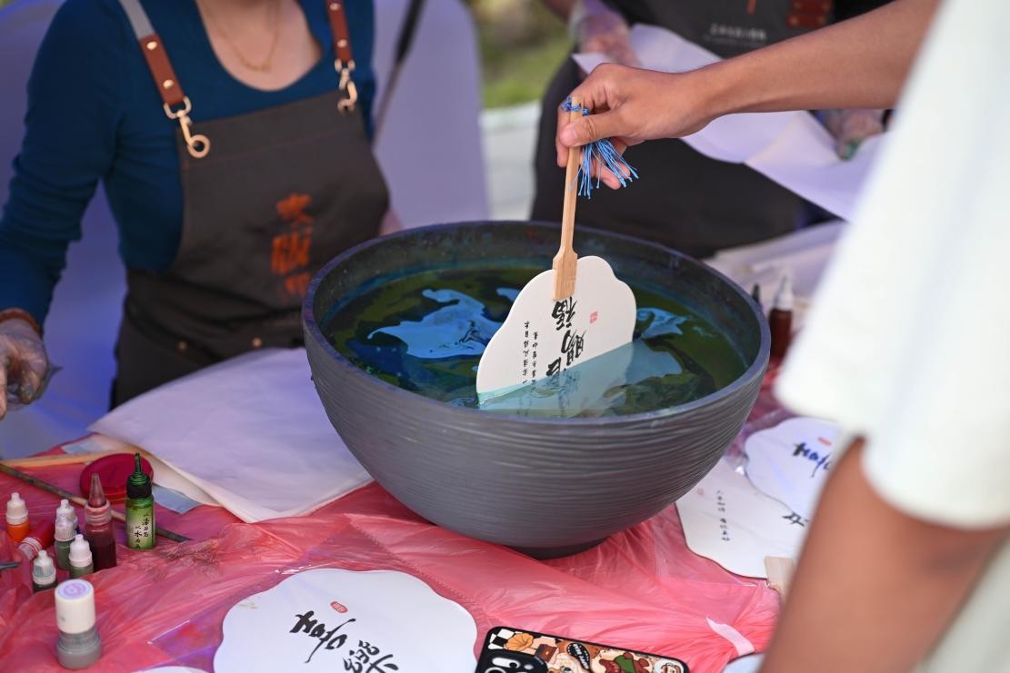 活动现场,丰富的体验项目吸引了众多同学踊跃参与。漆扇绘制、传统版刻、花灯制作三大体验区同步开放。漆扇体验区,志愿者们提前备齐素扇、漆料、刻版印章等材料,同学们挑选金、红、蓝等各色漆料进行水中晕染,原本素净的扇面在附着有流光溢彩漆料的水面中渐渐有了中秋的意境。