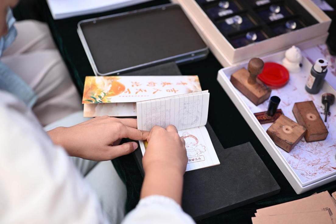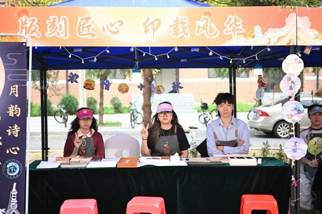 版印体验区,形态各异、主题丰富的印章整齐排开,生肖、中秋、校园地标等特色纹样应有尽有。同学们轻蘸印泥、稳稳按压,一个个色彩鲜明的印章便跃然纸上,成为独属于自己的珍贵纪念。