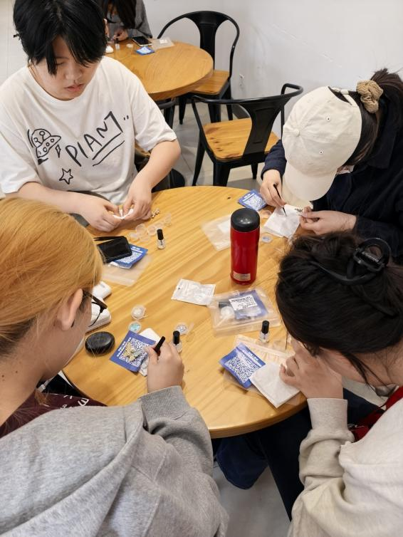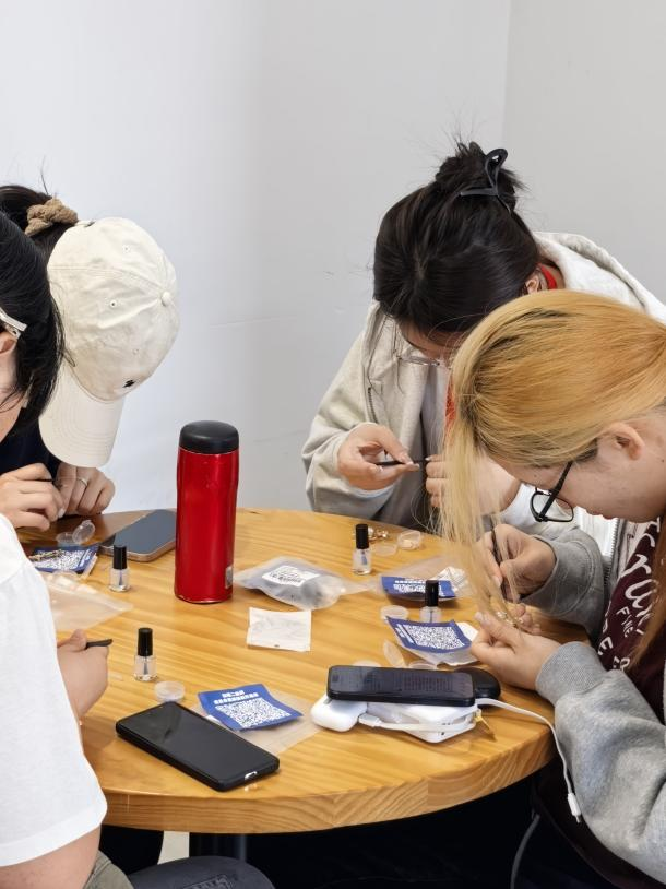 实践环节,同学们在志愿者指导下,从选贝、裁剪、拼贴到镶嵌、封层,一步步完成专属螺钿饰品制作。现场氛围安静而热烈,贝片碰撞的轻响、专注创作的身影、互相交流的轻声探讨,构成一幅青春与传统交融的生动画面。