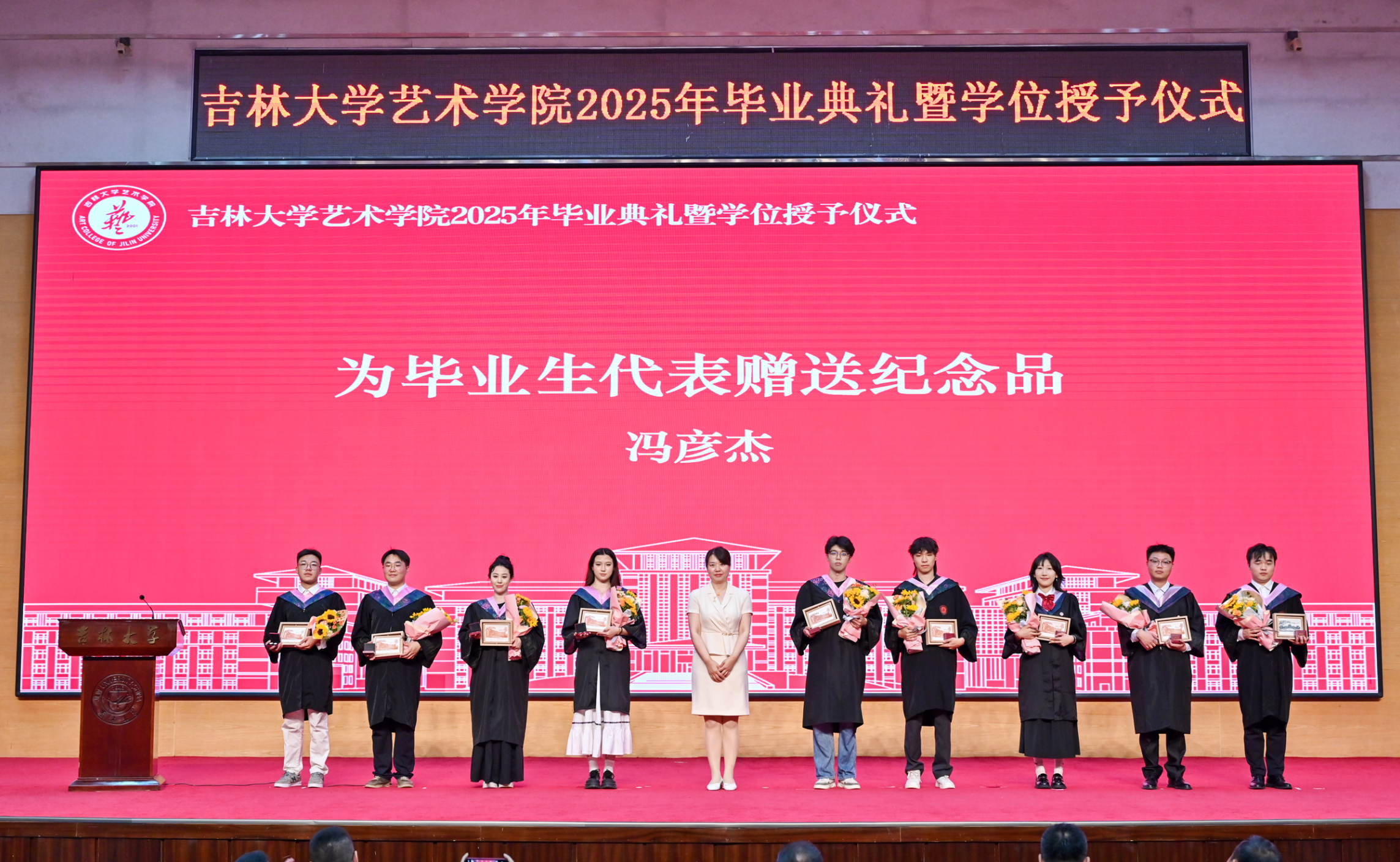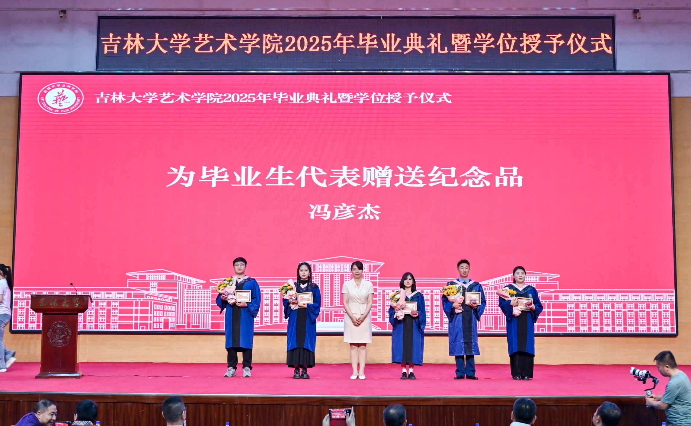 党委书记为冯彦杰为毕业生代表赠送纪念品并合影留念。